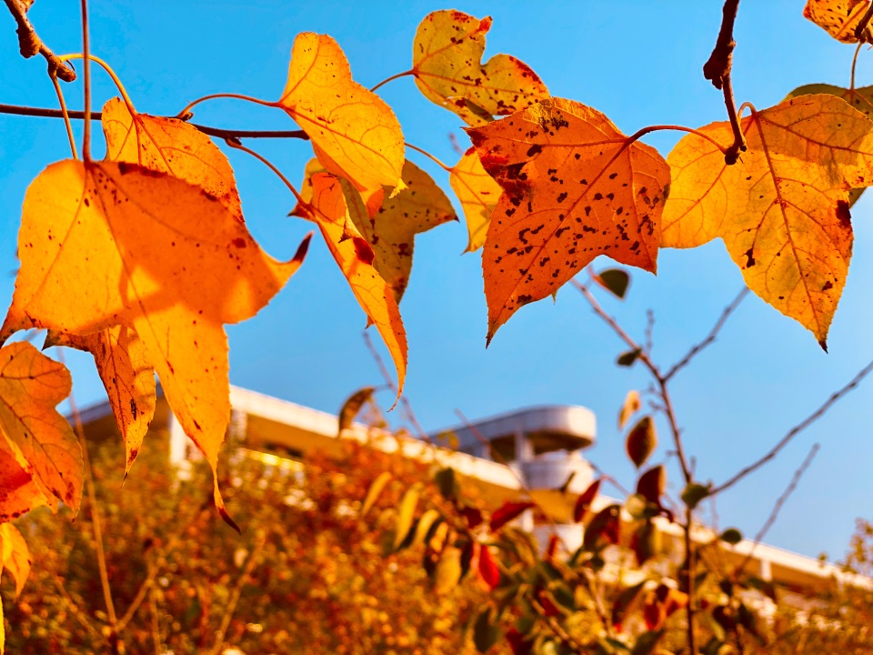 美丽的秋叶蕴涵着成熟的魅力,为秋天抹上了最后一笔艳丽。自古逢秋悲寂寥,我言秋日胜春朝。在秋意浓浓的校园里,享受着绚烂的美好、诗意的栖居,满满的幸福,真是赏心乐事!