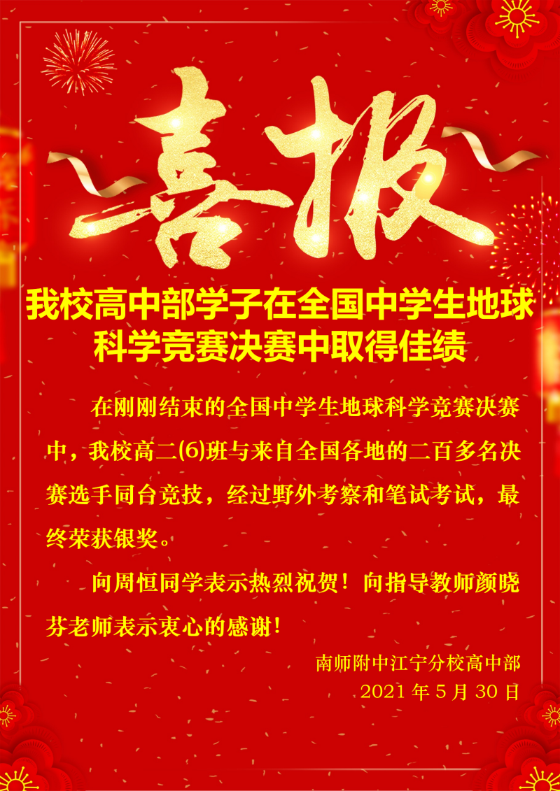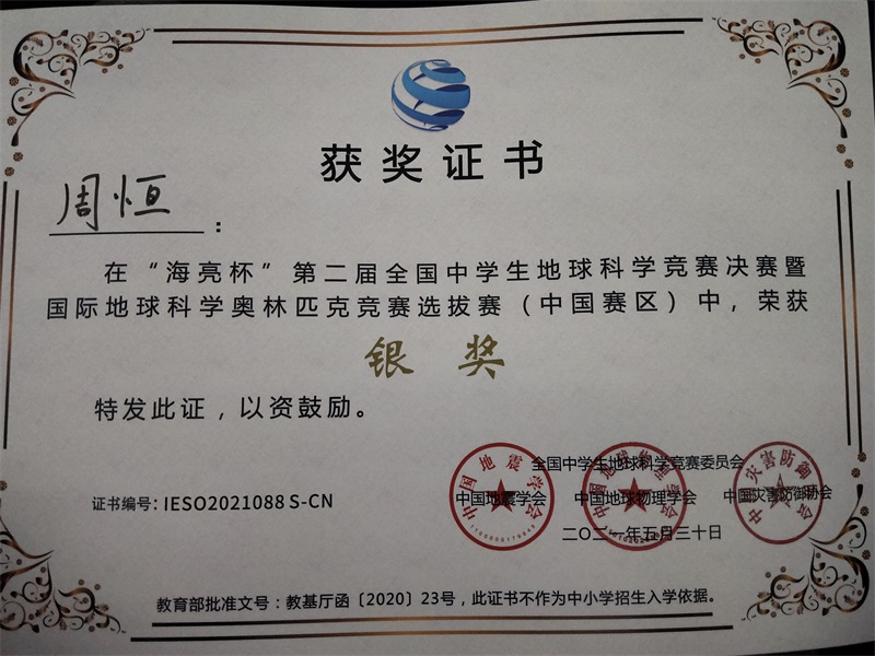 在刚刚举行的全国中学生地球科学竞赛决赛中,我校高二(6)班周恒同学与来自全国各地的二百多名决赛选手同台竞技,经过野外考察和笔试考试,最终荣获银奖。